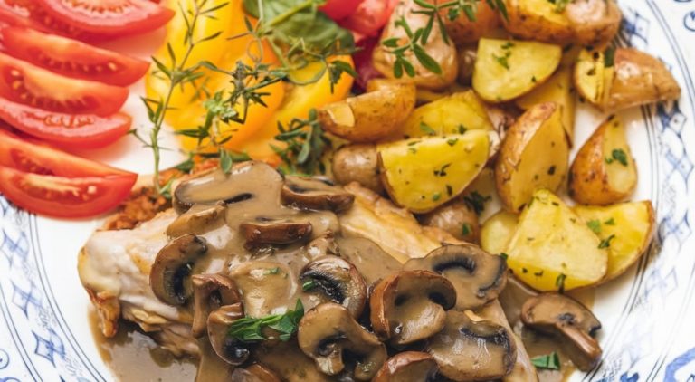 Λεπτό φιλέτο κοτόπουλου με μανιτάρια και ψητές πατάτες